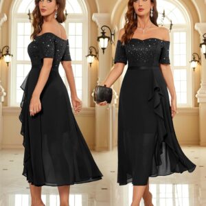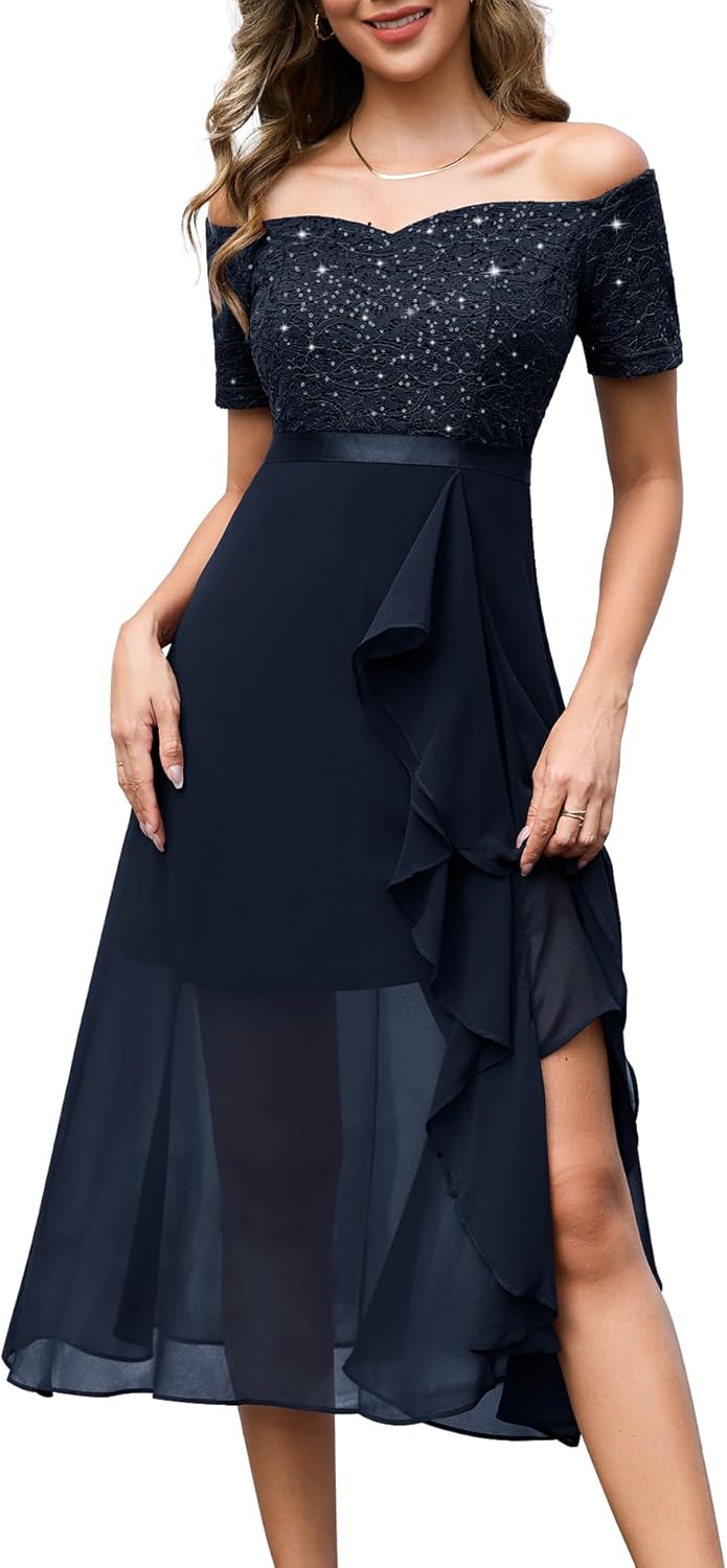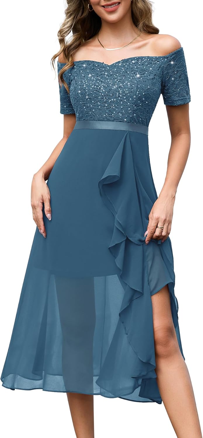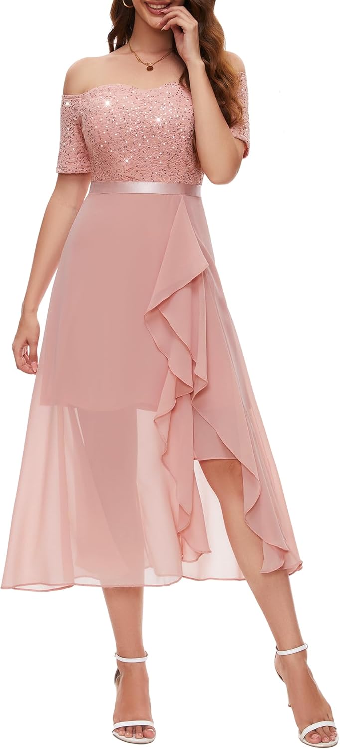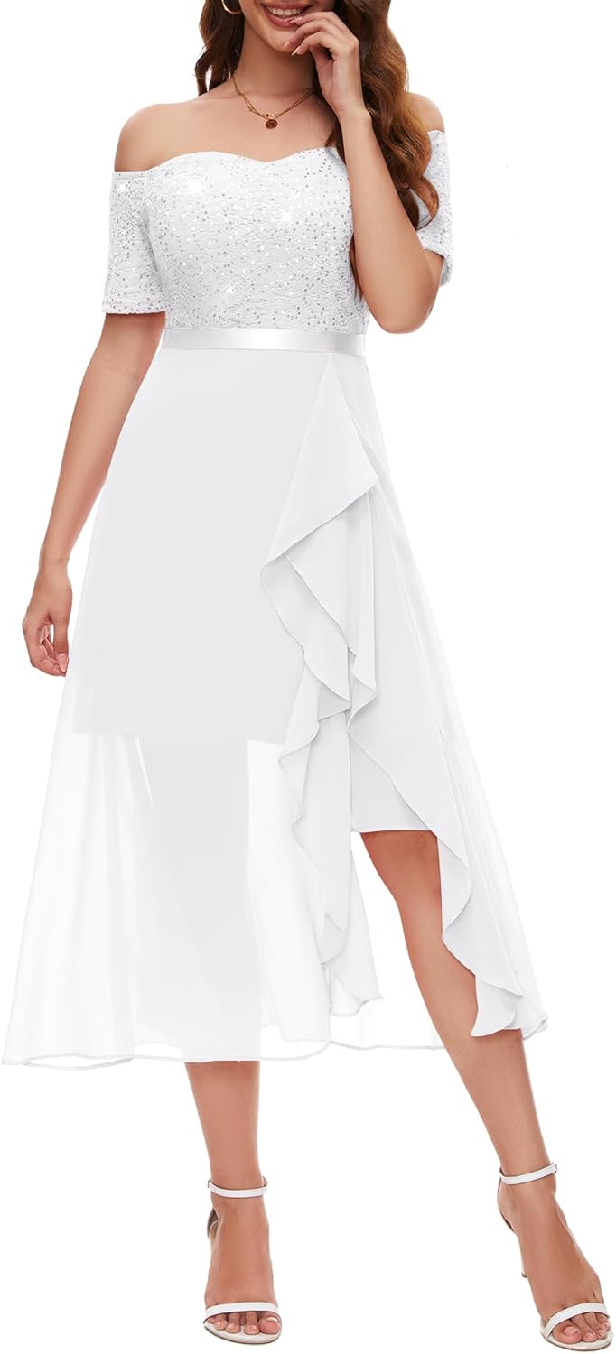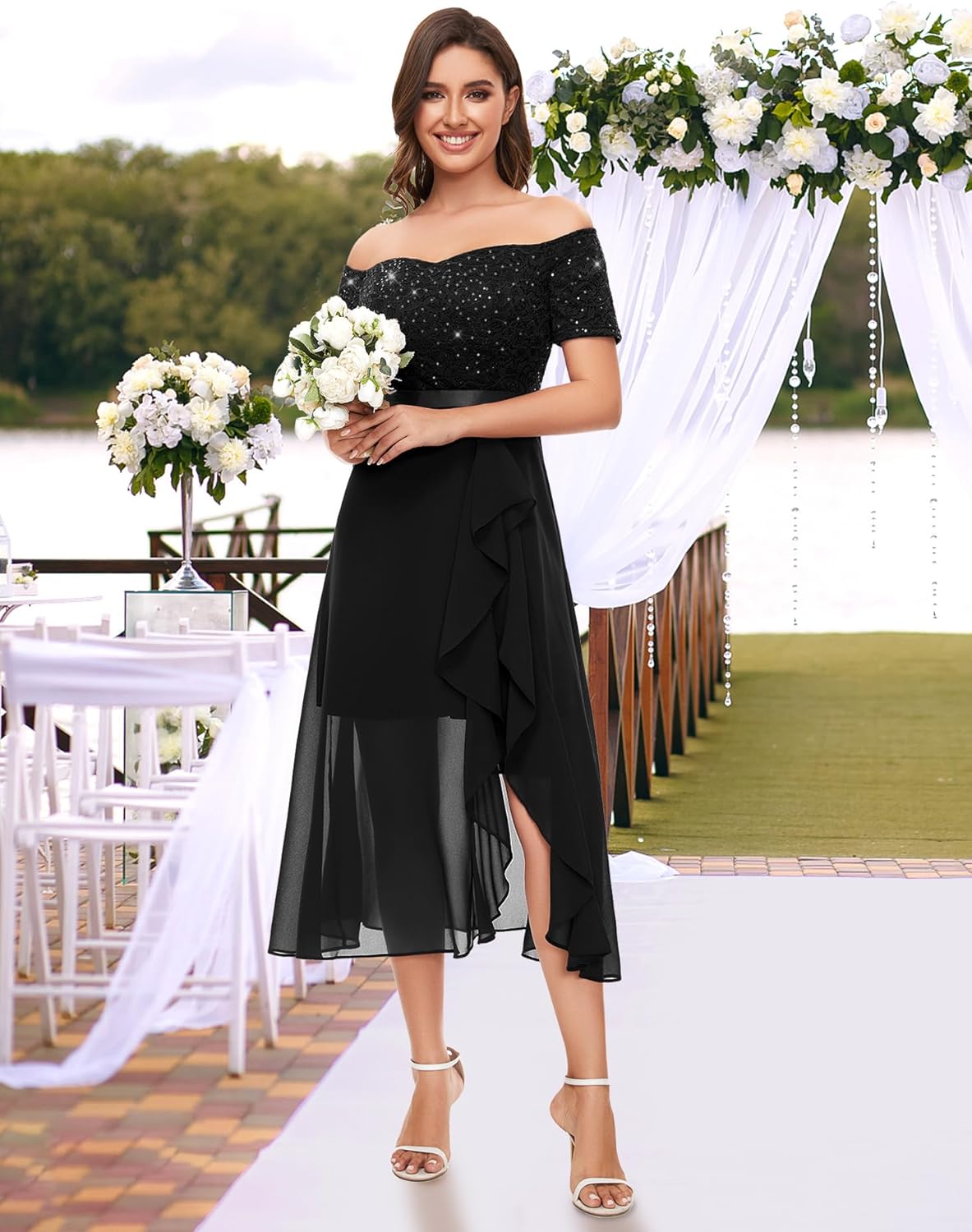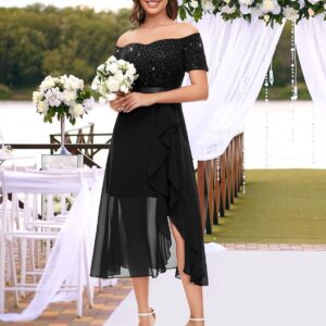 BeryLove Homecoming Sequin Formal Party Dress Off Shoulder Wedding Cocktail Midi Evening Dress