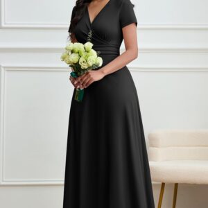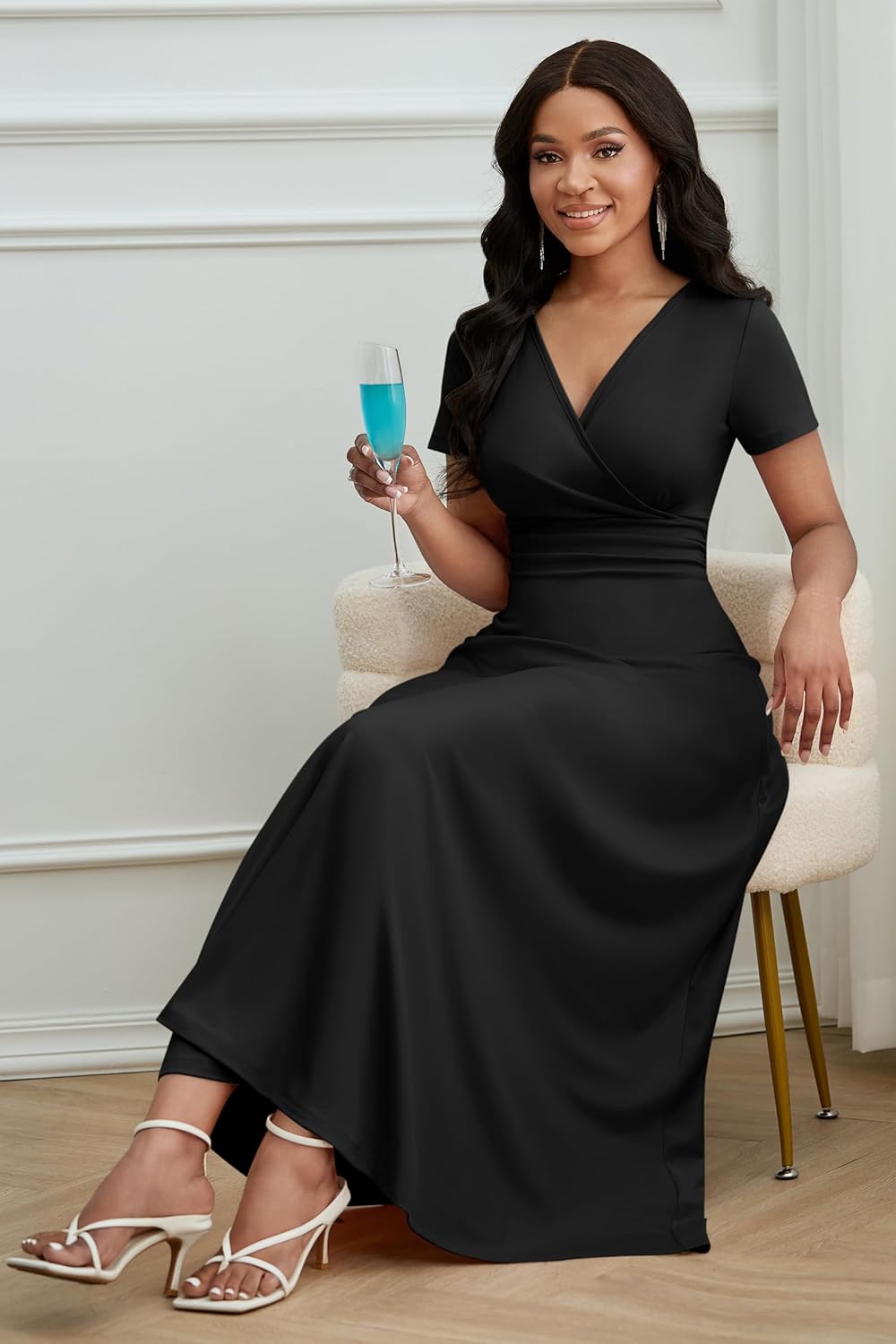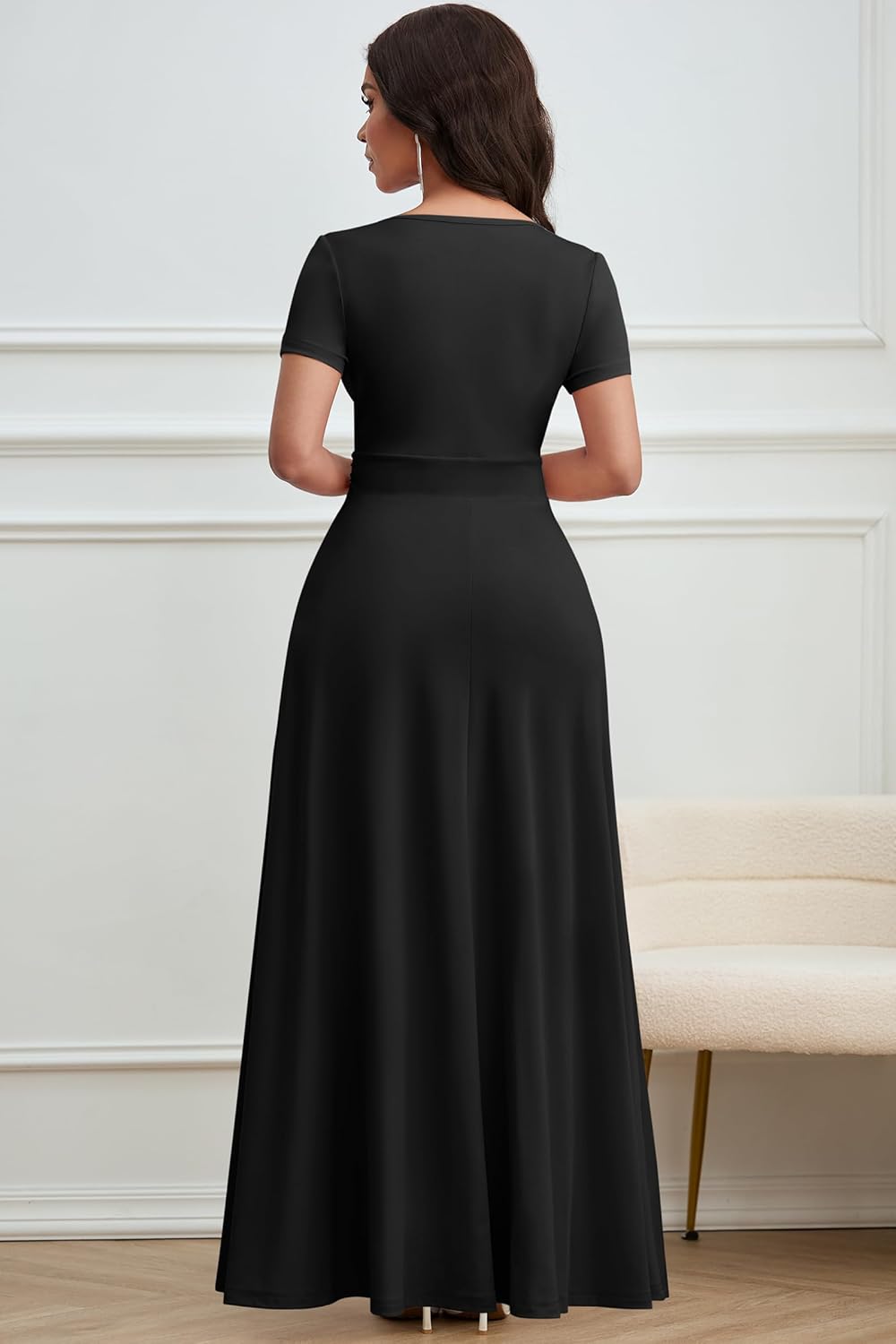 CLOCOR Maxi Dress for Women Long Formal Short Sleeve A Line V Neck Dresses Wedding Guest High Waist Elegant