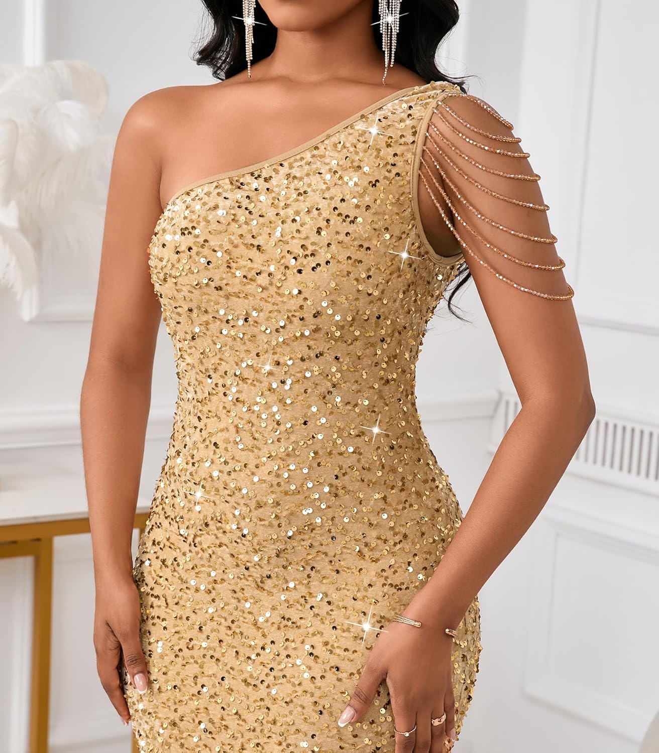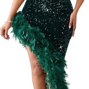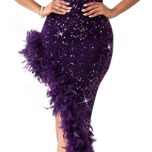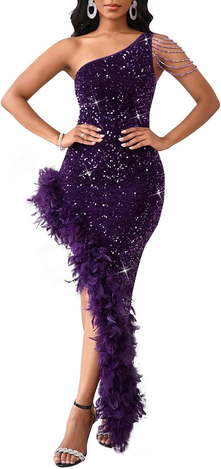 Cololura Women Sequin Elegant Sexy Tassels One Shoulder Mermaid Bodycon Cocktail Evening Midi Party Formal Dress