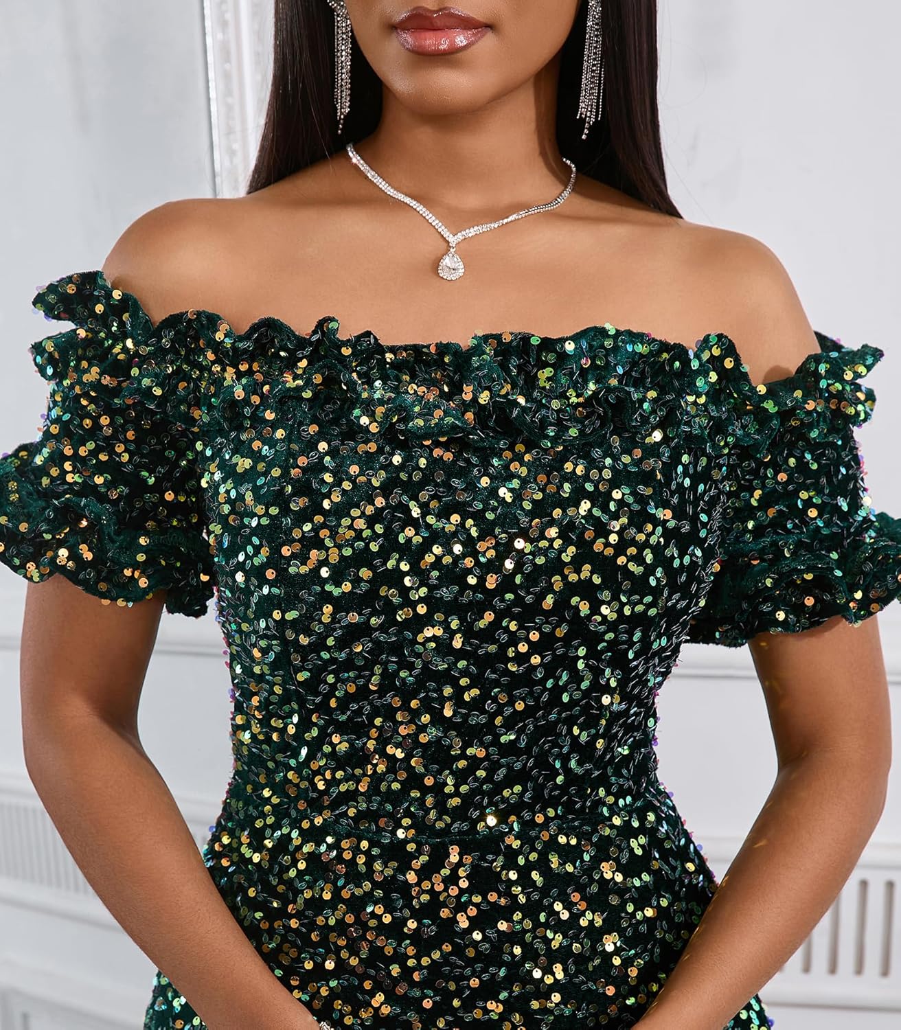 dasmzper Women Sexy Sequin Off Shoulder Ruffle Short Sleeve Bodycon Mermaid Party Formal Evening Maxi Dress