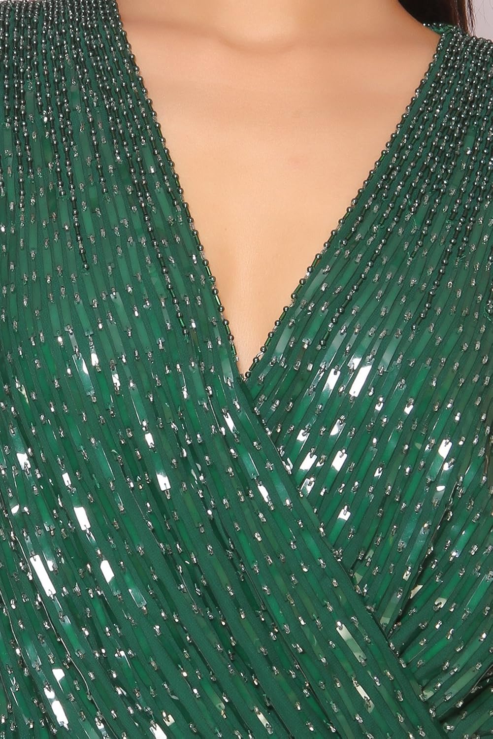 Emerald Green gown with overlap V-neck and HandEmbroidery in Georgette . Material: Georgette. Size: Small. Size:Small, Bust: 32-34, Waist: 26-28, Hip: 34-36