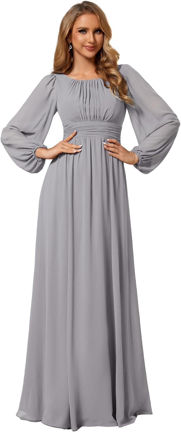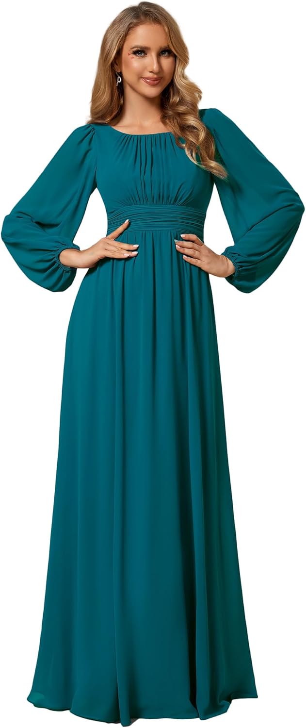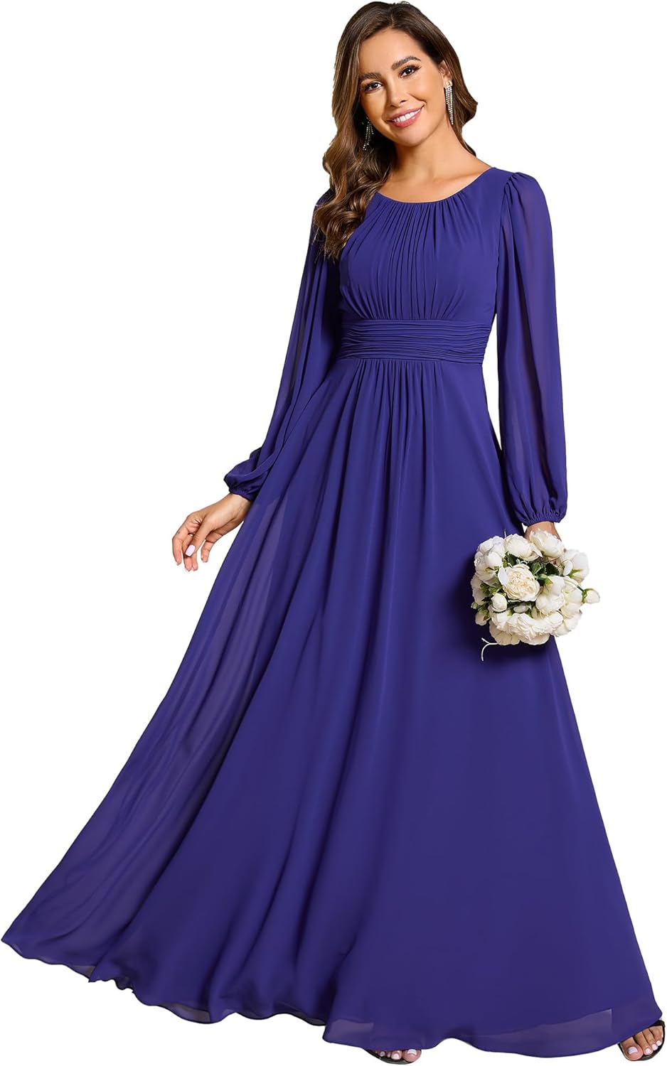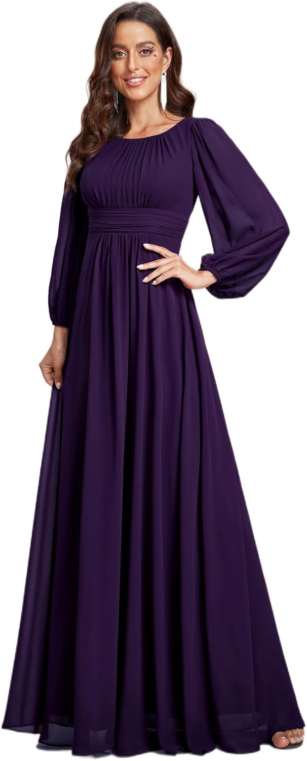 Ever-Pretty Women’s Crewneck Long Lantern Sleeves Floor Length A-Line Pleated Chiffon Formal Dress 0106B