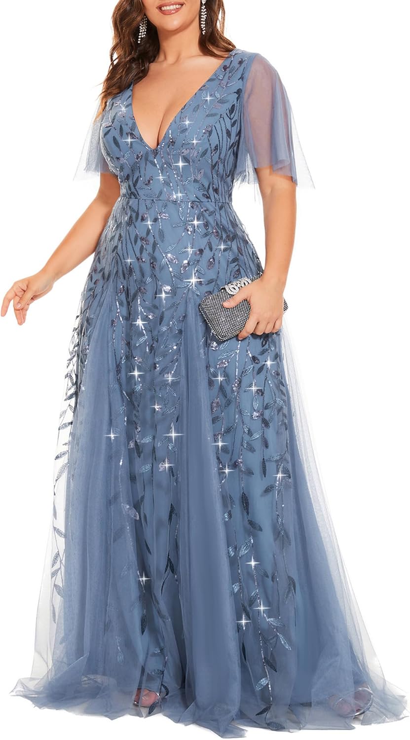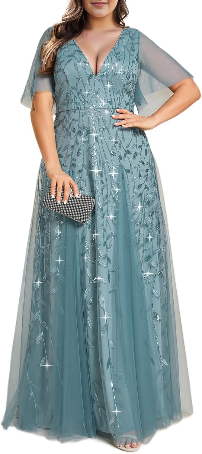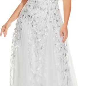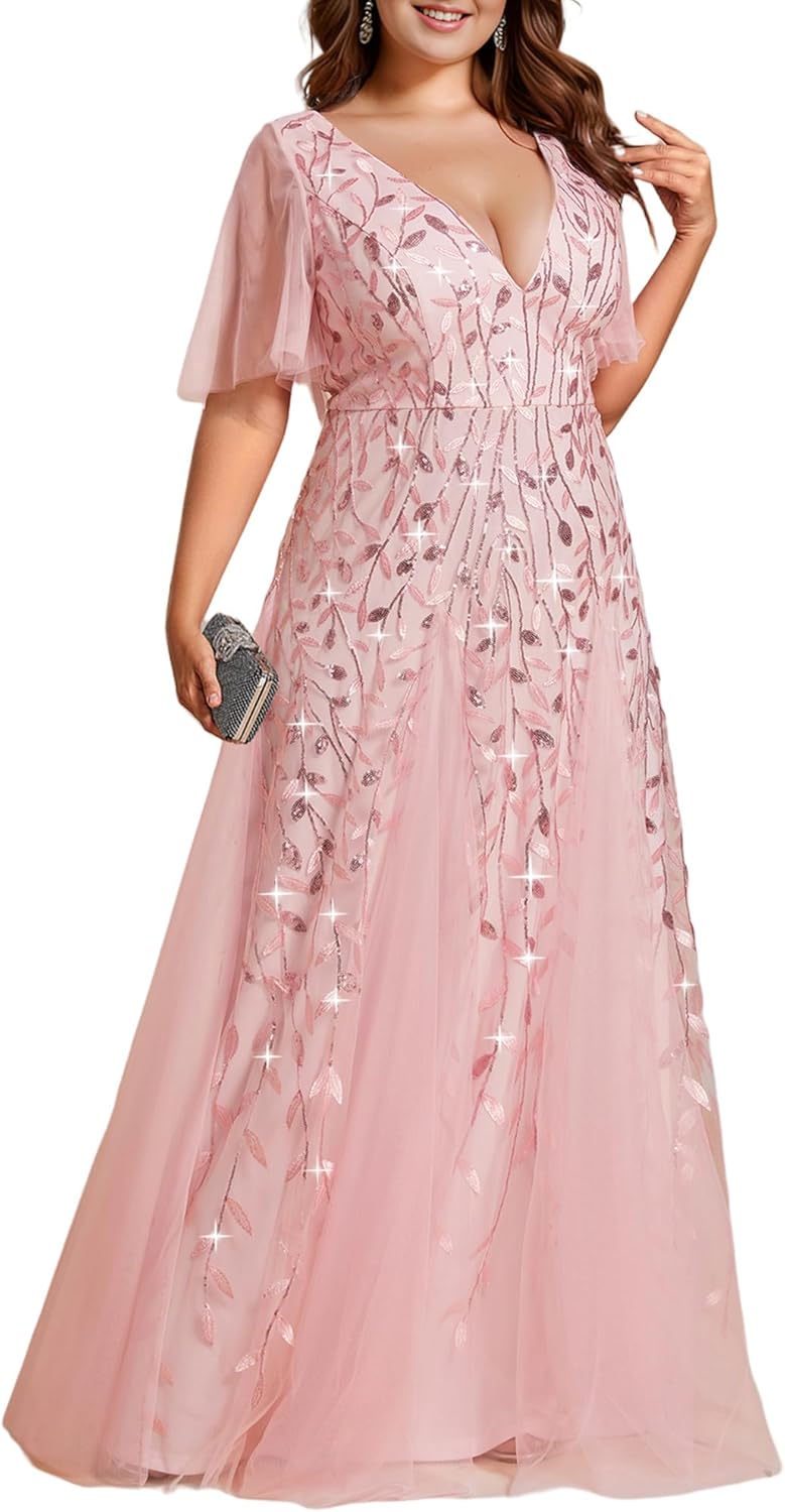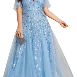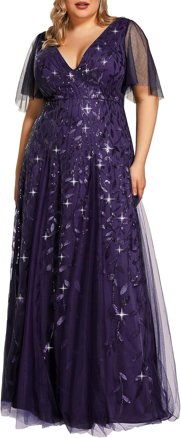 Ever-Pretty Womens Plus Size V-Neck Sequin Emboridery Formal Evening Dresses with Sleeves 00736-PZ