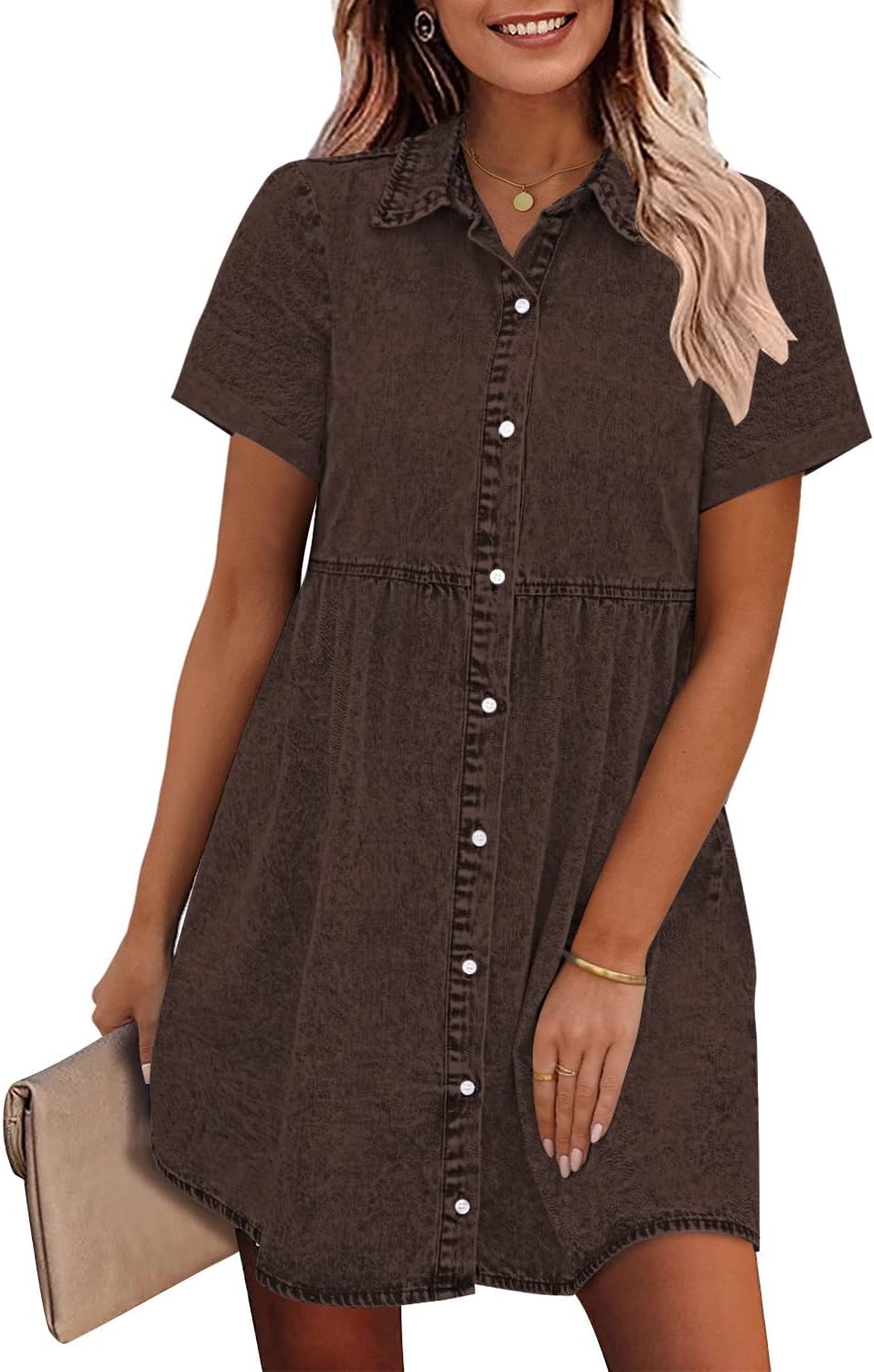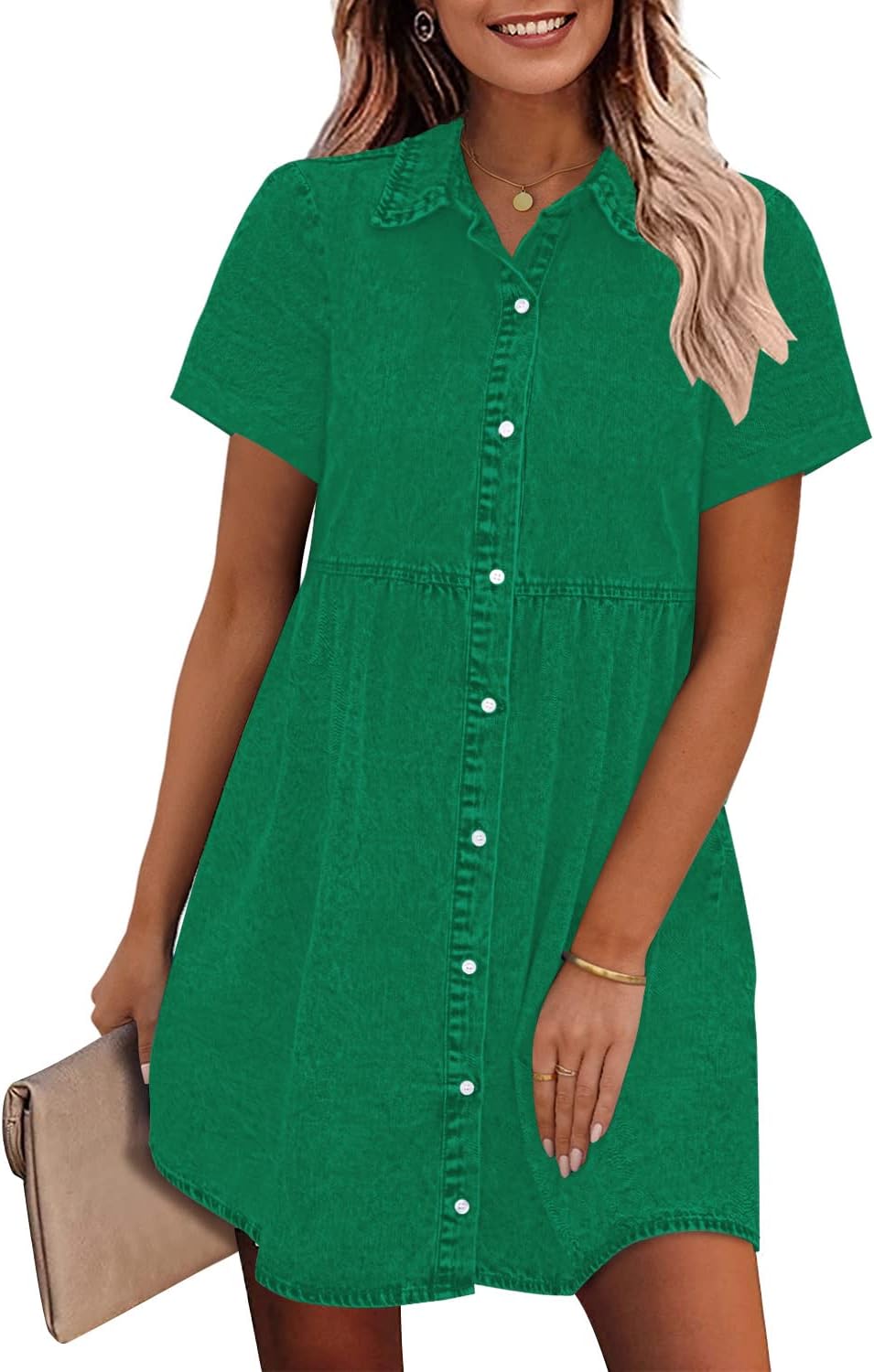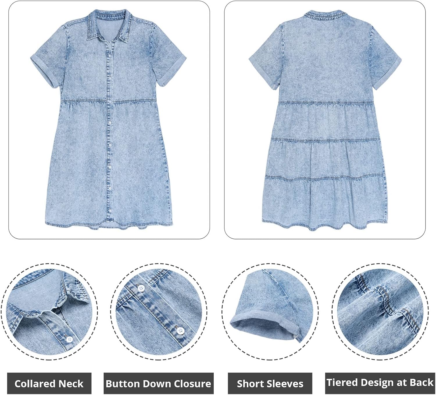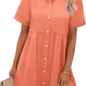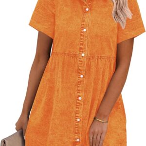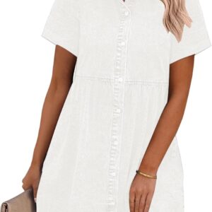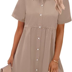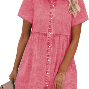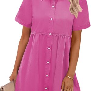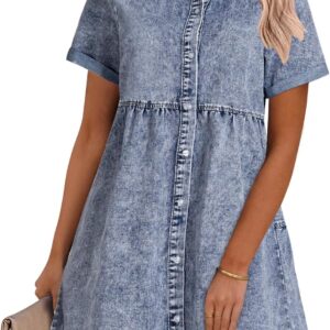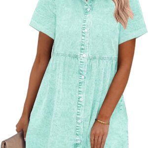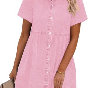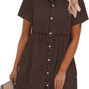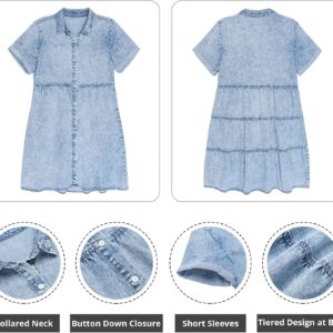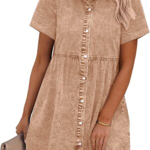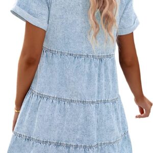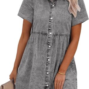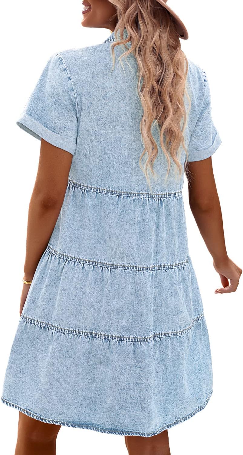 GRAPENT Denim Dress for Women Babydoll Tiered Short Sleeve Button Down Jean Shirt Dresses