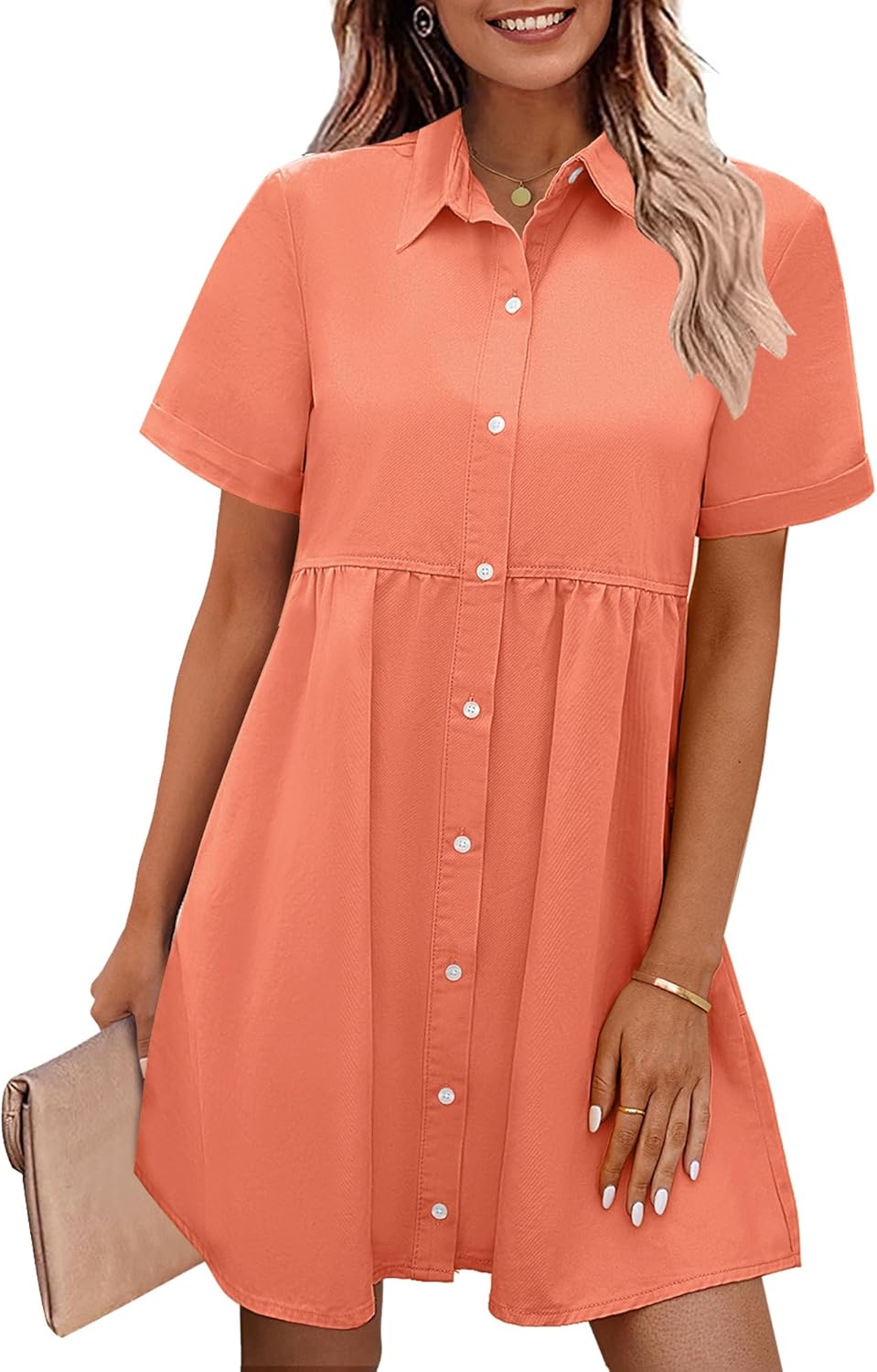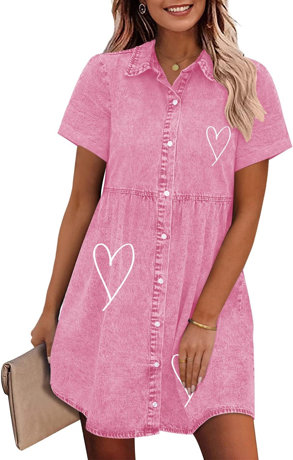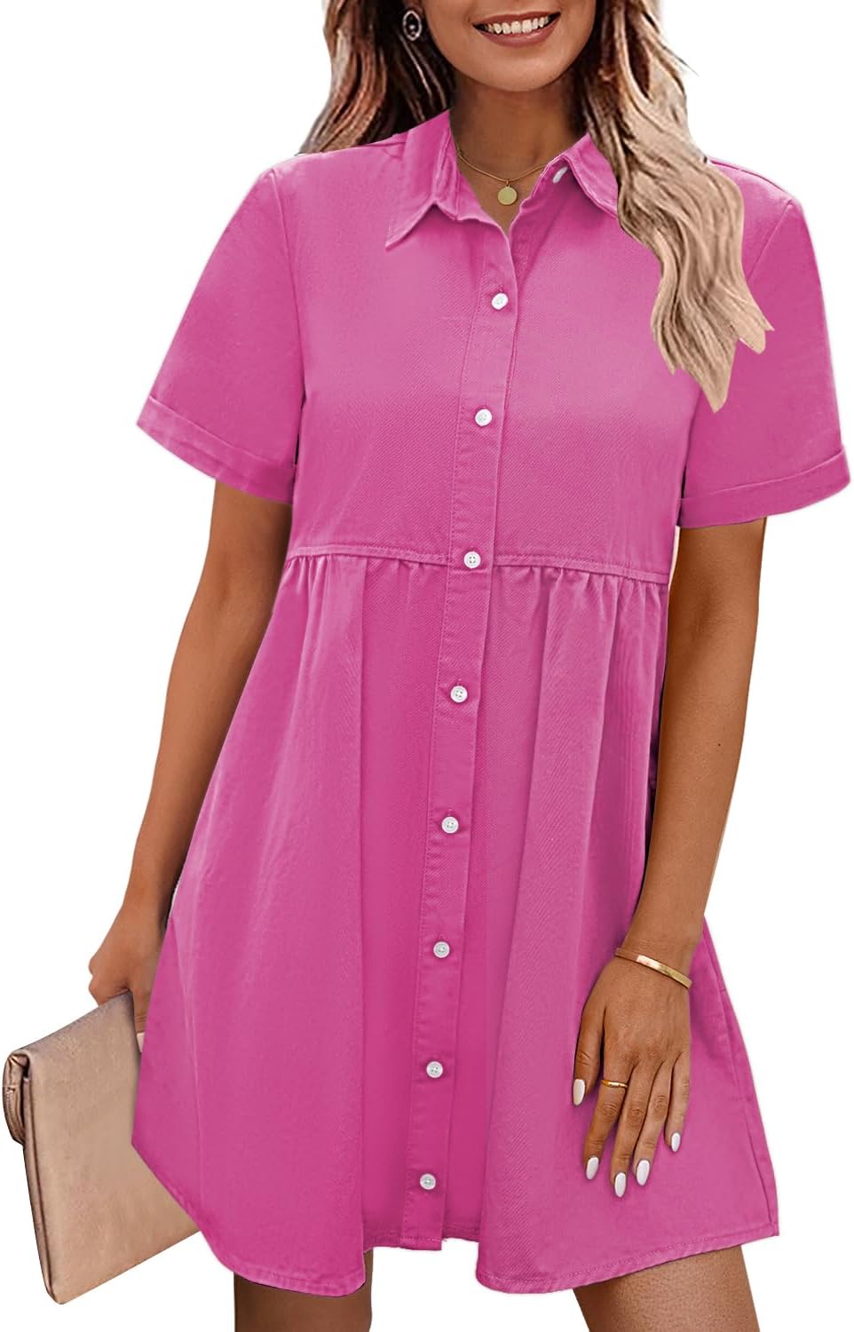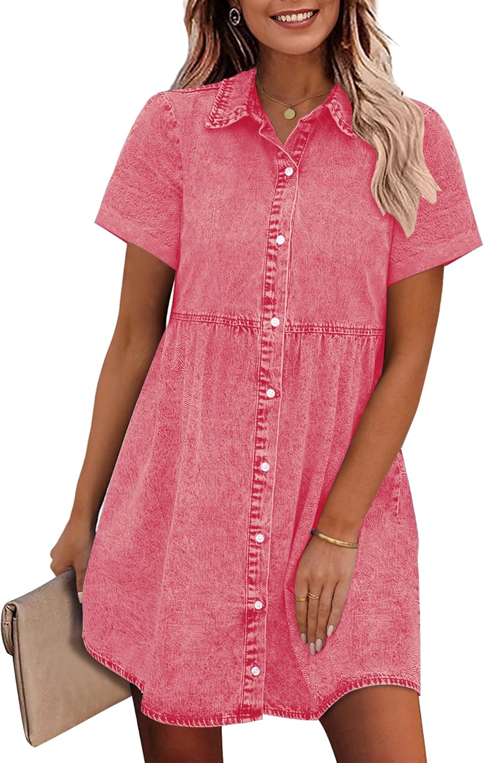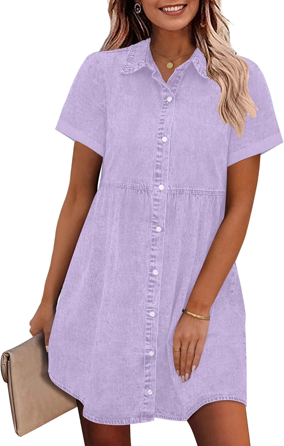 GRAPENT Denim Dress for Women Babydoll Tiered Short Sleeve Button Down Jean Shirt Dresses