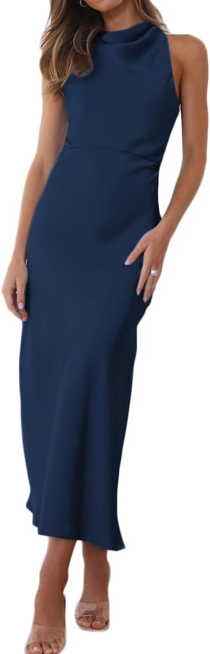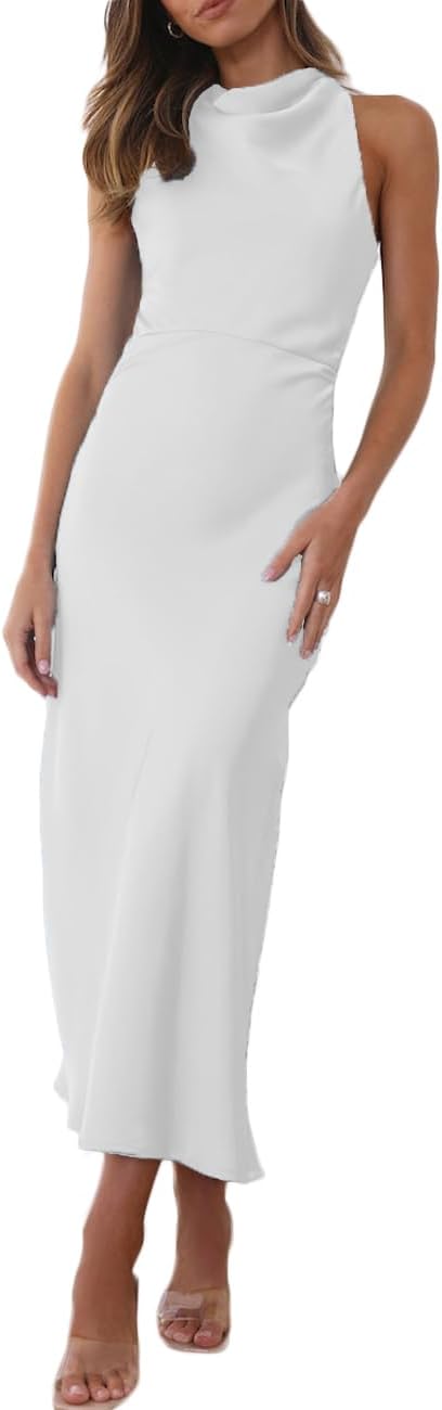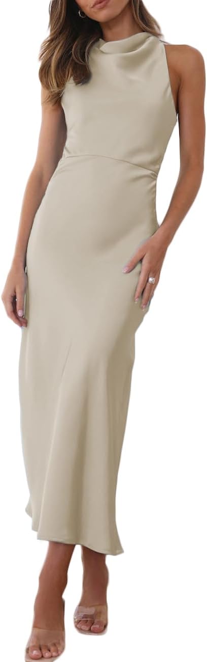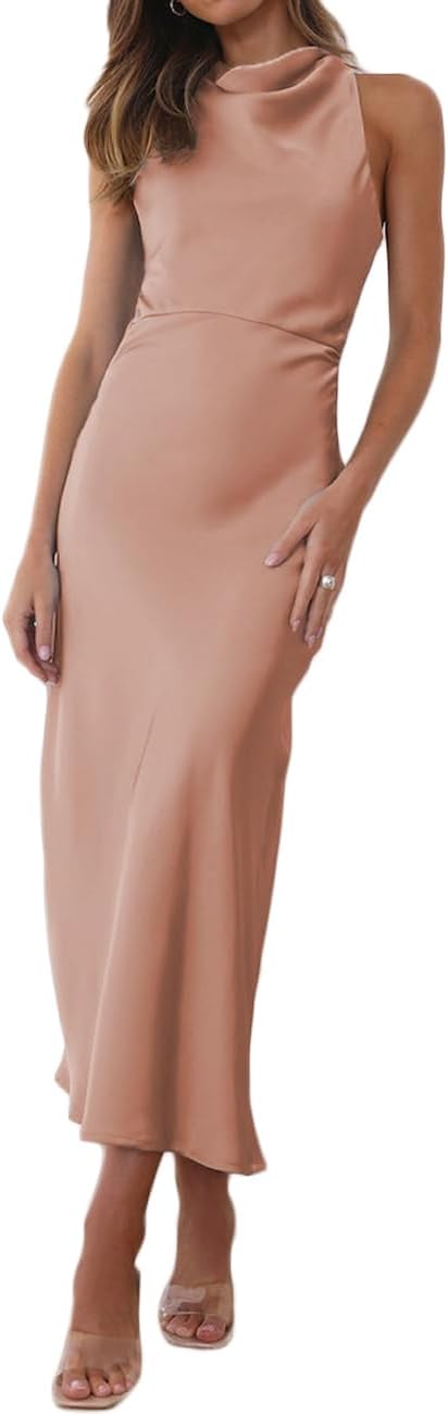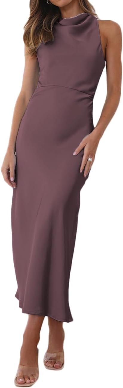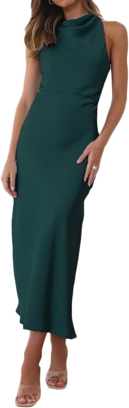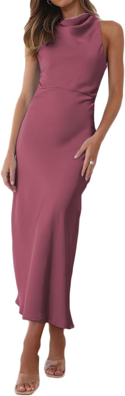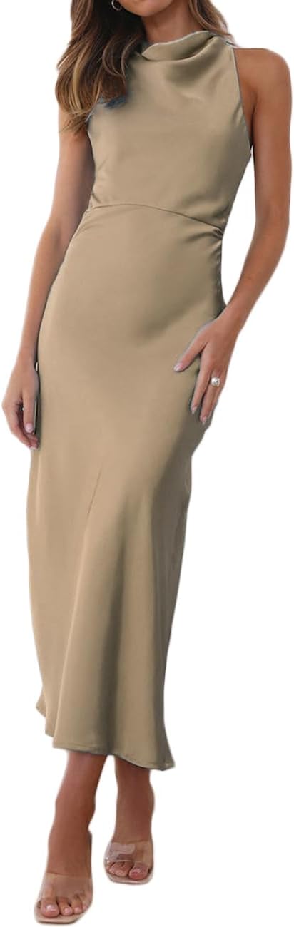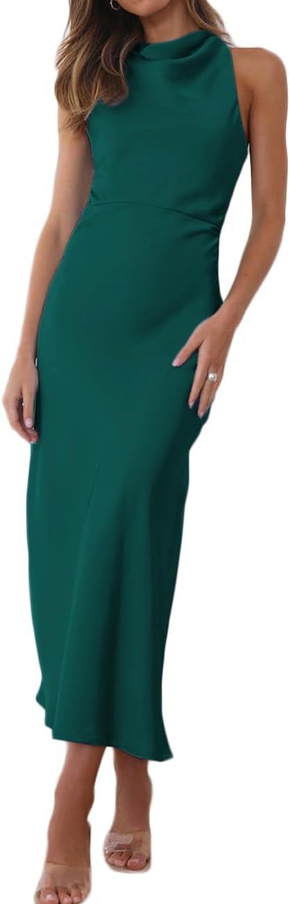 Halfisland Silk Mock Neck Backless Sleeveless Midi Dresses for Women