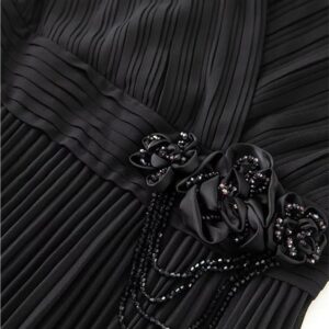 - This vintage black beaded dress features a flattering V-neck, pleated skirt, and short sleeves— for formal parties or evening events.