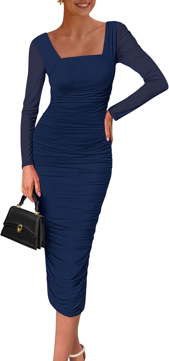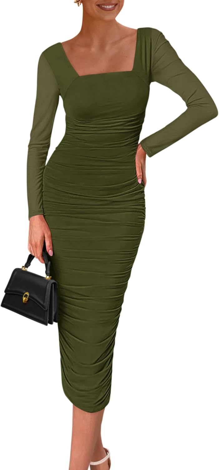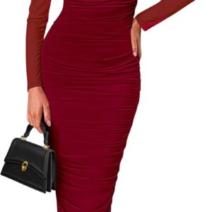 PRETTYGARDEN Fall Wedding Guest Dresses for Women 2025 Ruched Bodycon Midi Long Sleeve Formal Cocktail Dress