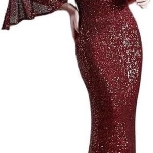 Women’s Red Sequin Long Sleeve V-Neck Mermaid Evening Gown Formal Prom Wedding Guest Cocktail Dress